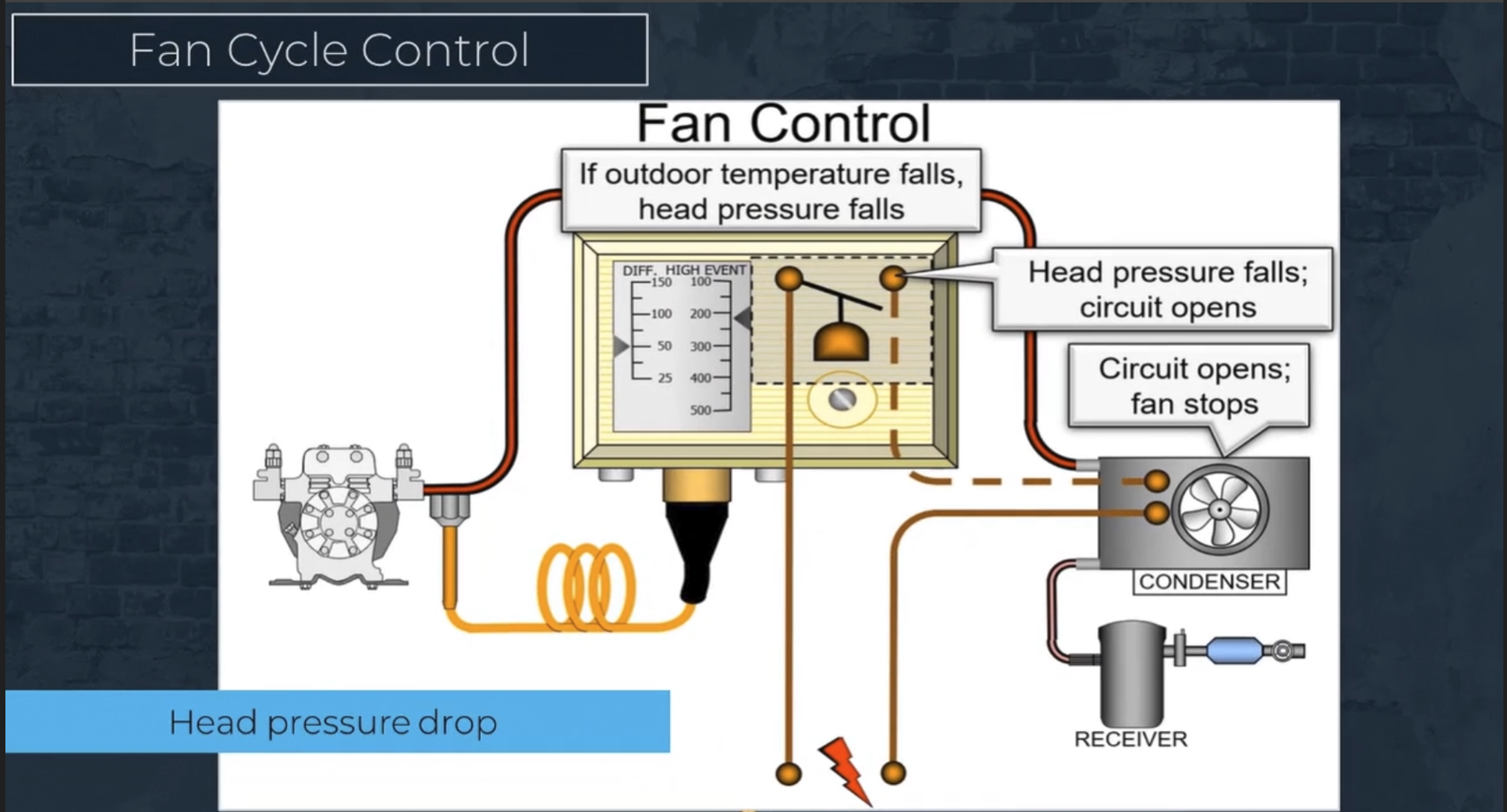 The operation of a fan cycling low ambient control follows a simple pressure-based sequence: