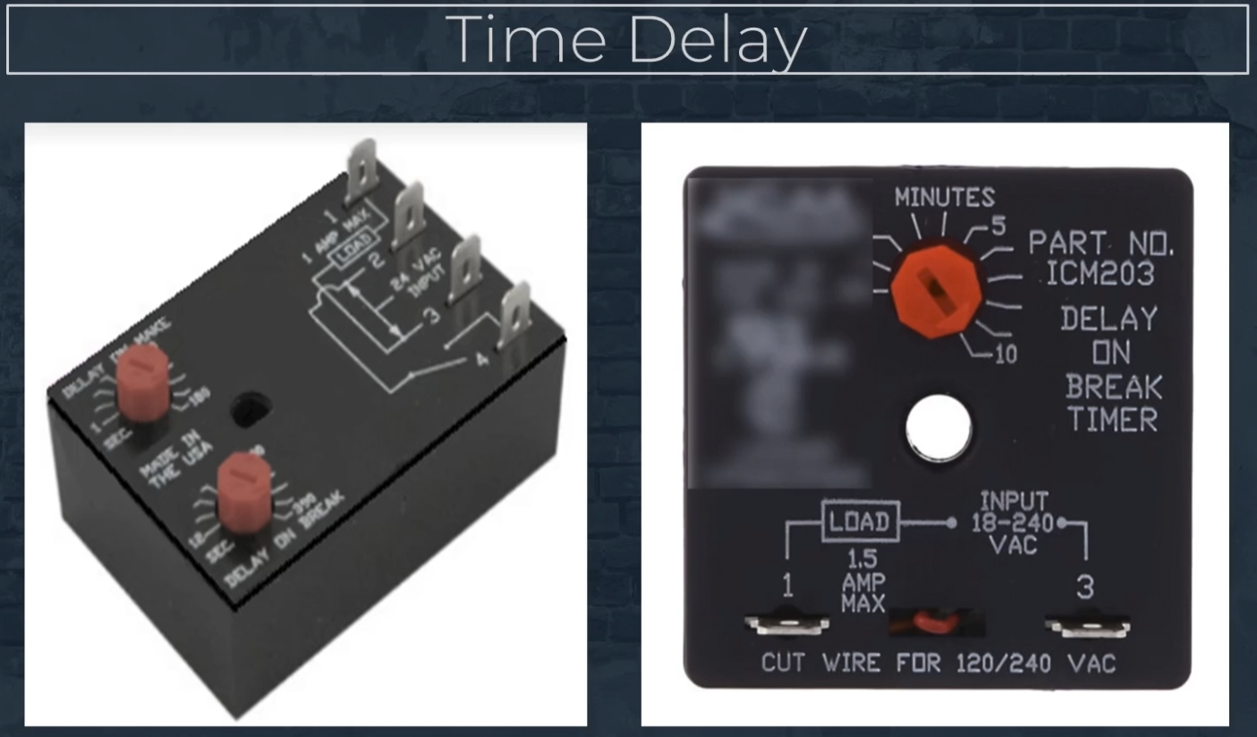 A time delay relay allows contacts to open or close after a preset delay rather than immediately. One common example is a fan delay with a delay on break, where the fan continues running for a set period after power is removed.